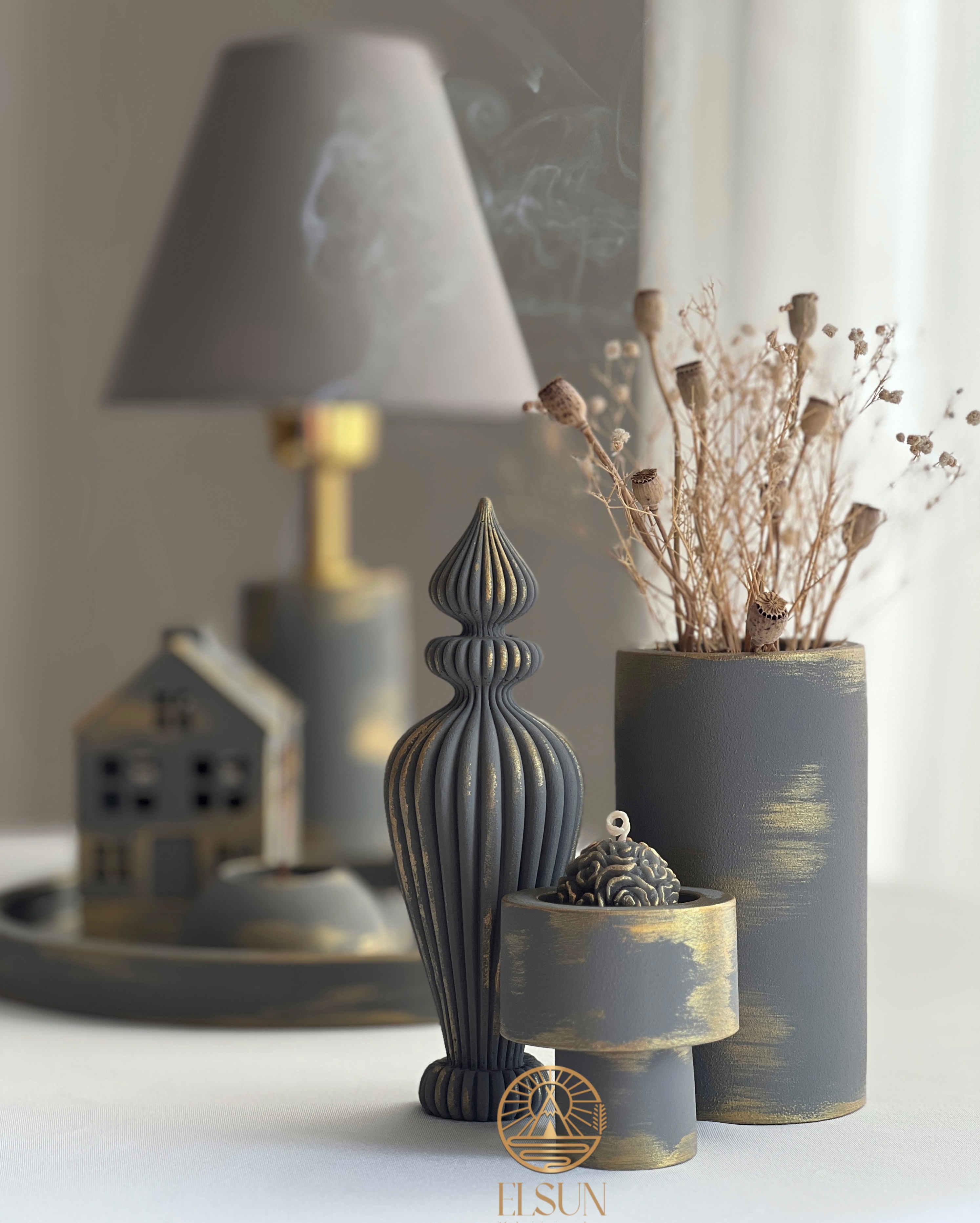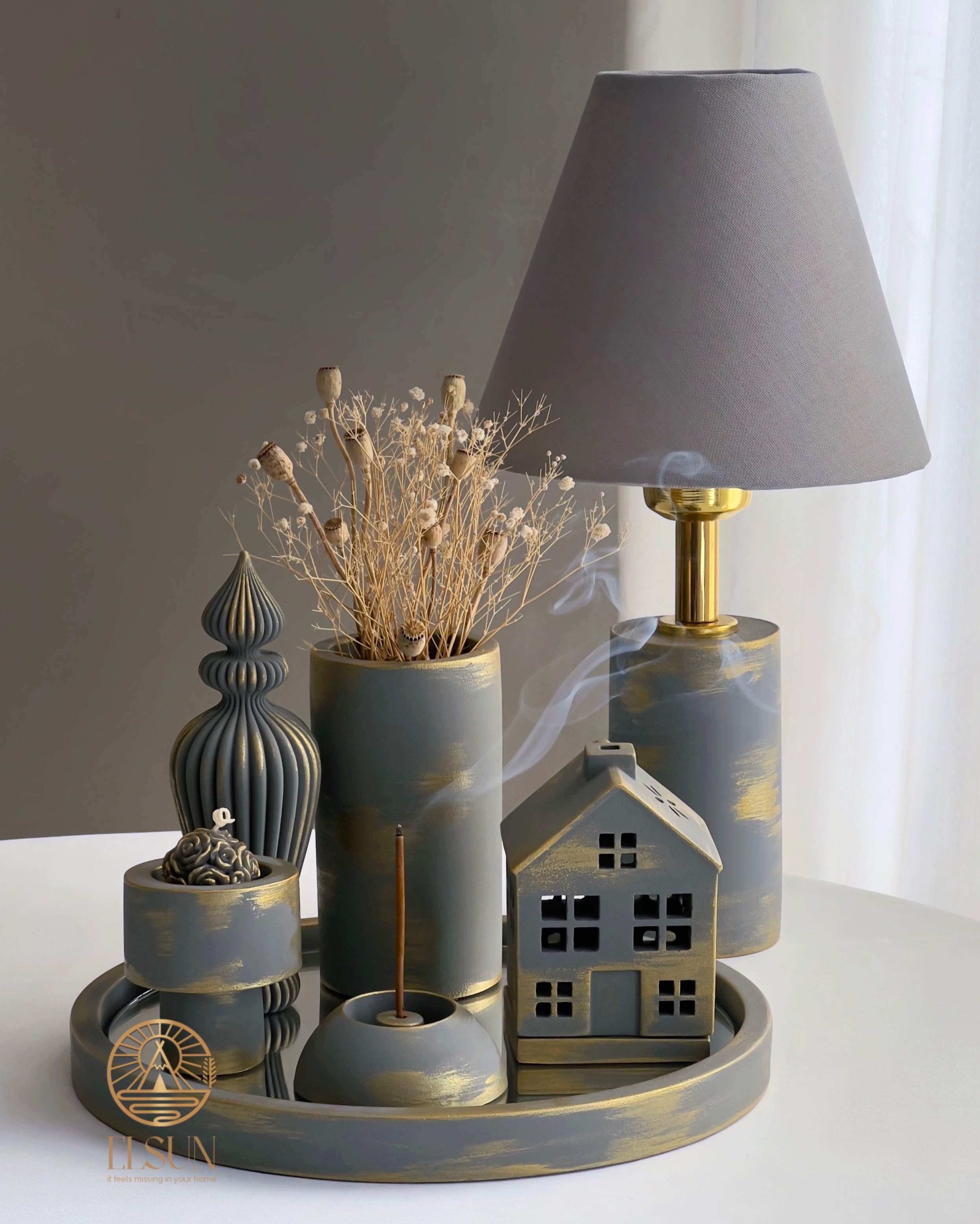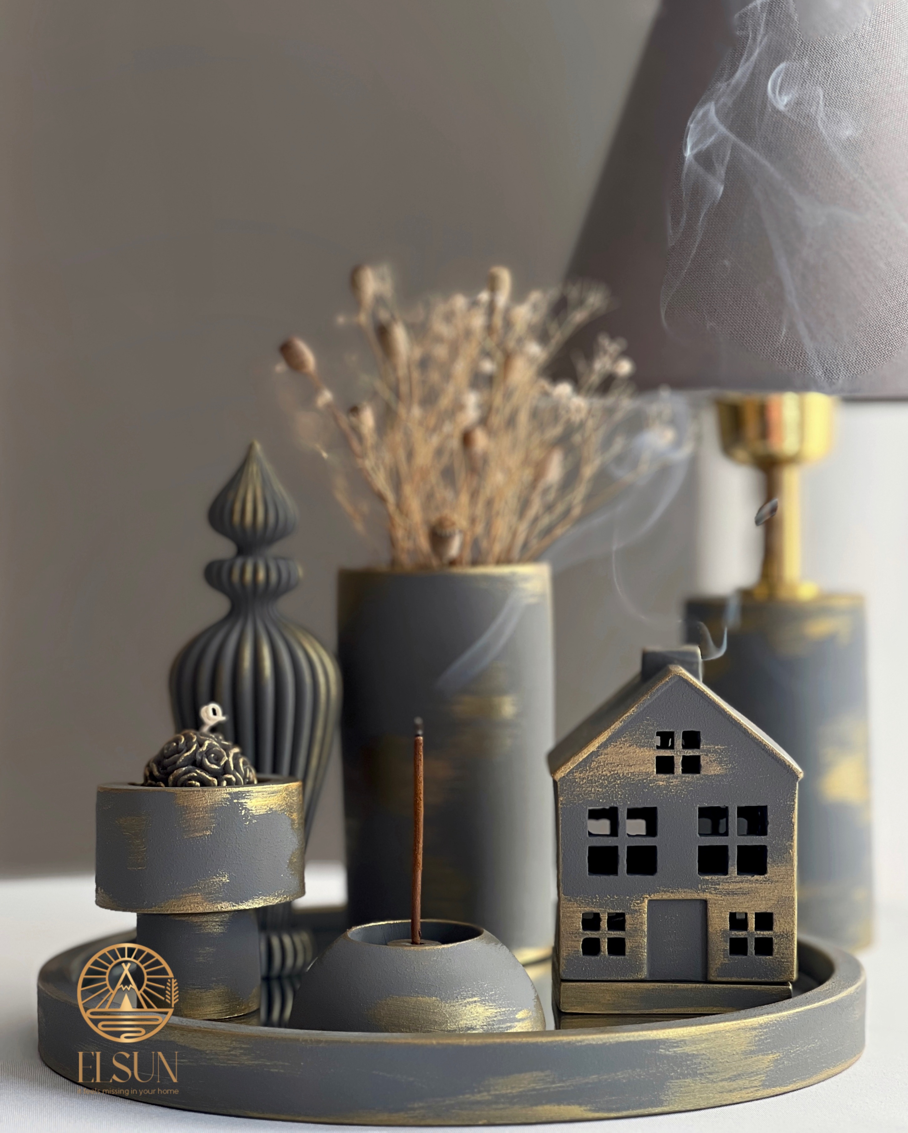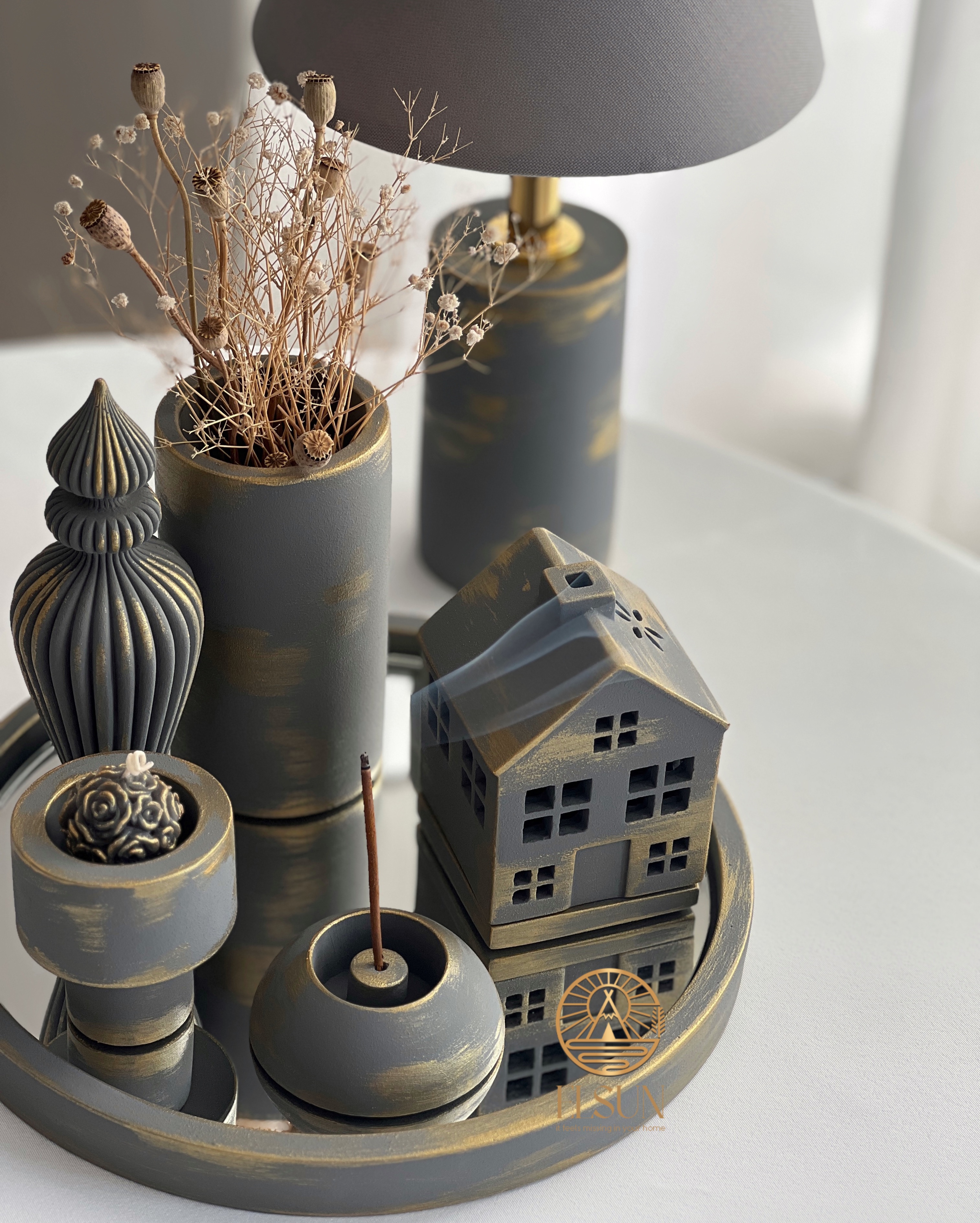 ست دکوری پتینه طوسی طلایی کد 197 شامل سینی دایره کف آینه، گلدان، کلبه، مجسمه، جاشمعی و شمع گل، جاعودی و آباژور مطابق تصویر می باشد؛ این دکوری لوکس مناسب سلیقه های خاص است و باعث ایجاد فضایی شیک و لاکچری می شود.