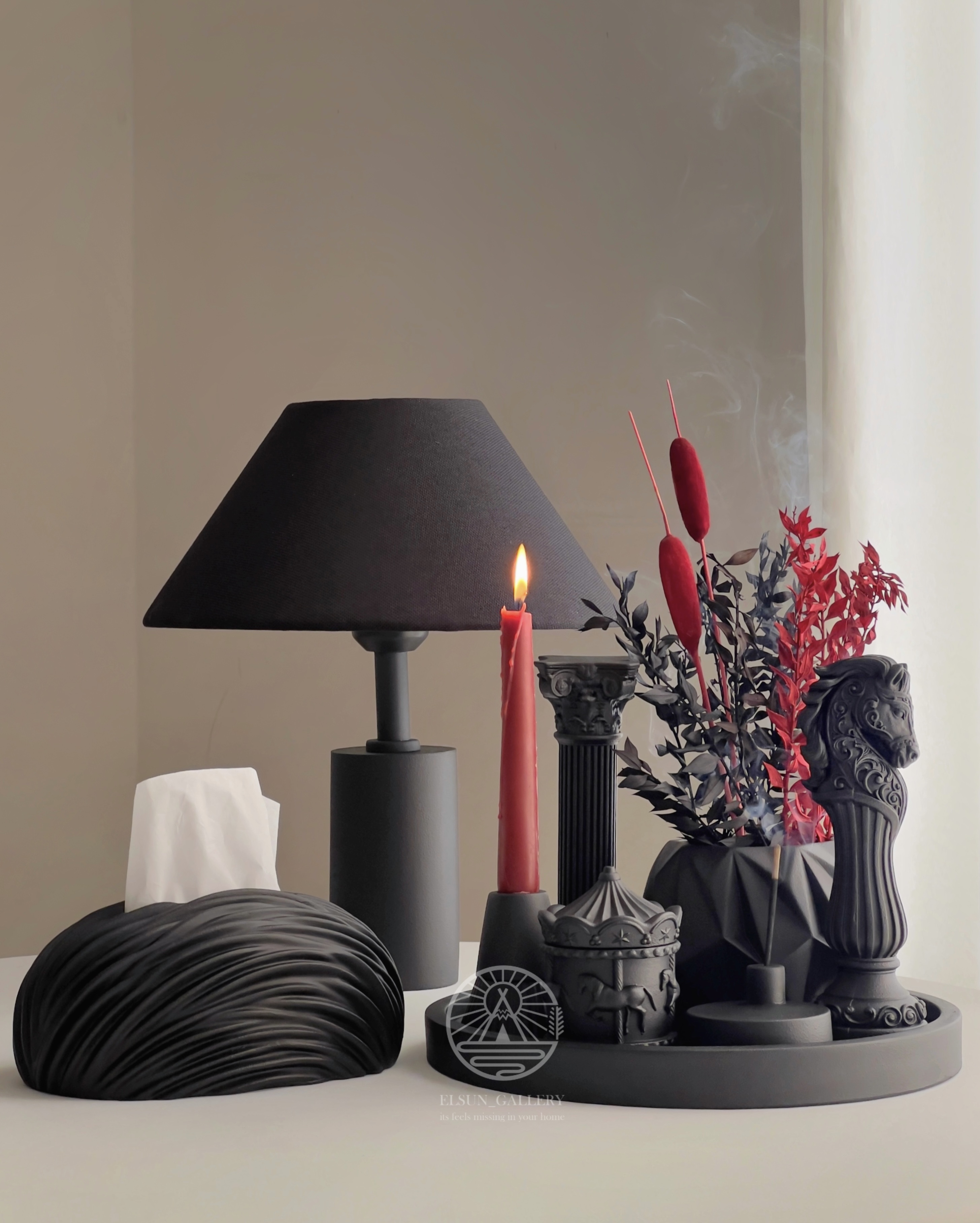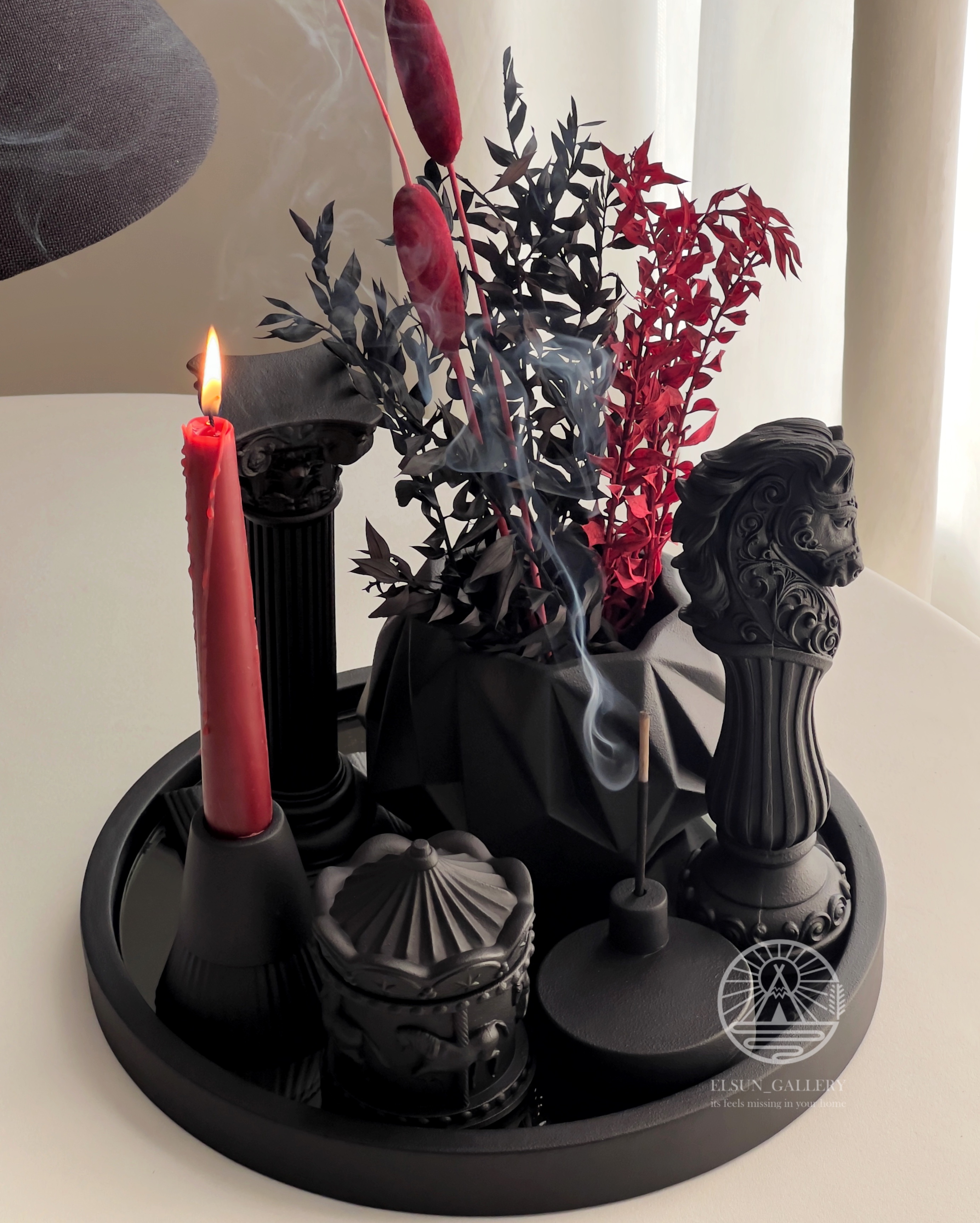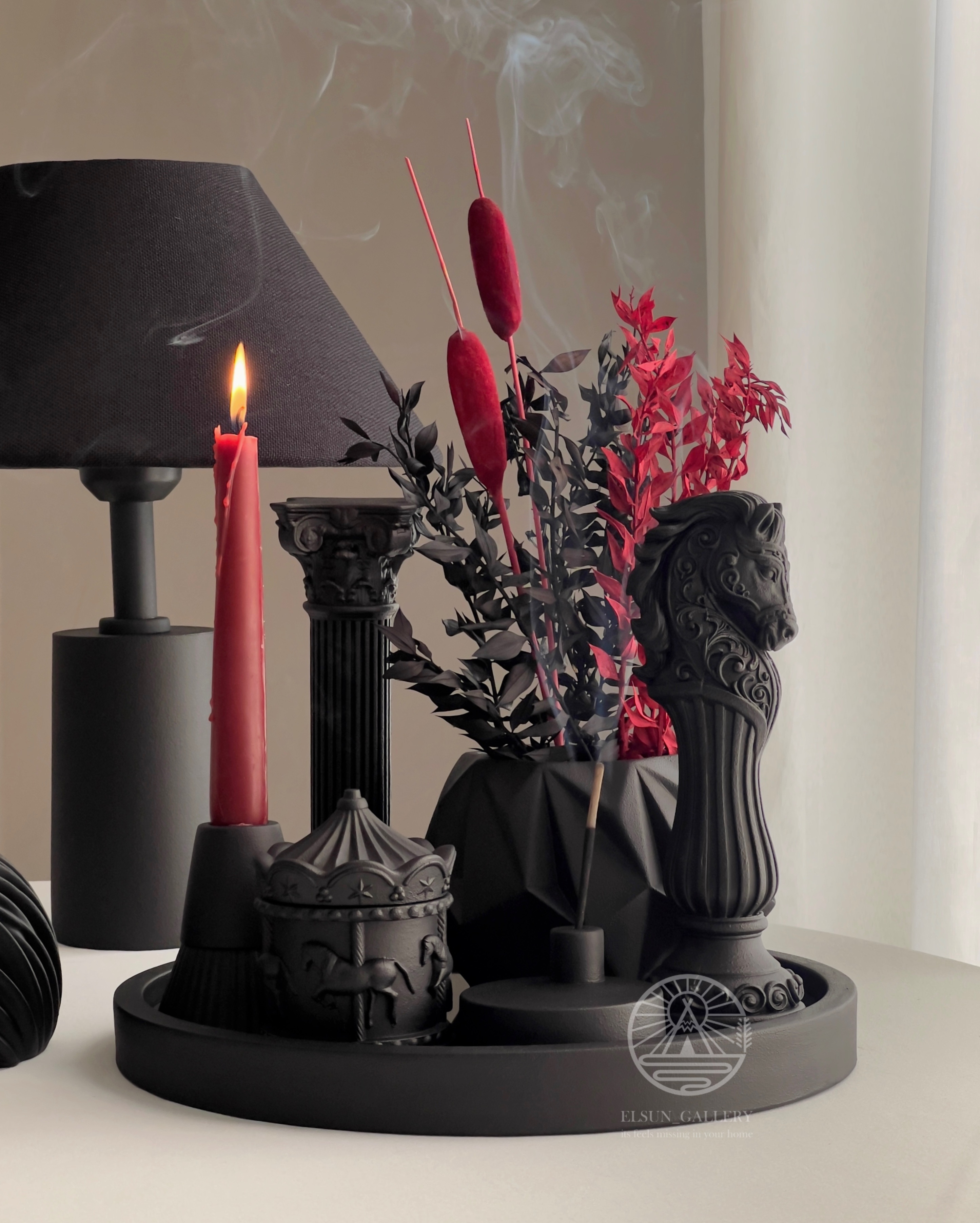 ست دکوری مشکی زرشکی کد 240 شامل سینی دایره کف آینه، گلدان، مجسمه اسب، ستون، جاشمعی و شمع قلمی، کاروسل، جاعودی، جادستمالی و آباژور مطابق تصویر می باشد؛ این دکوری لوکس مناسب سلیقه های خاص است و باعث ایجاد فضایی شیک و لاکچری می شود.